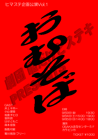 ![]() | ヒマステ企画公演Vol .1 「おむそば」 1999.9/3(Fri)--9/5(Sun) 演出・構成:劇団暇だけどステキ 観客動員 216名くらい 大阪造型センター5F |